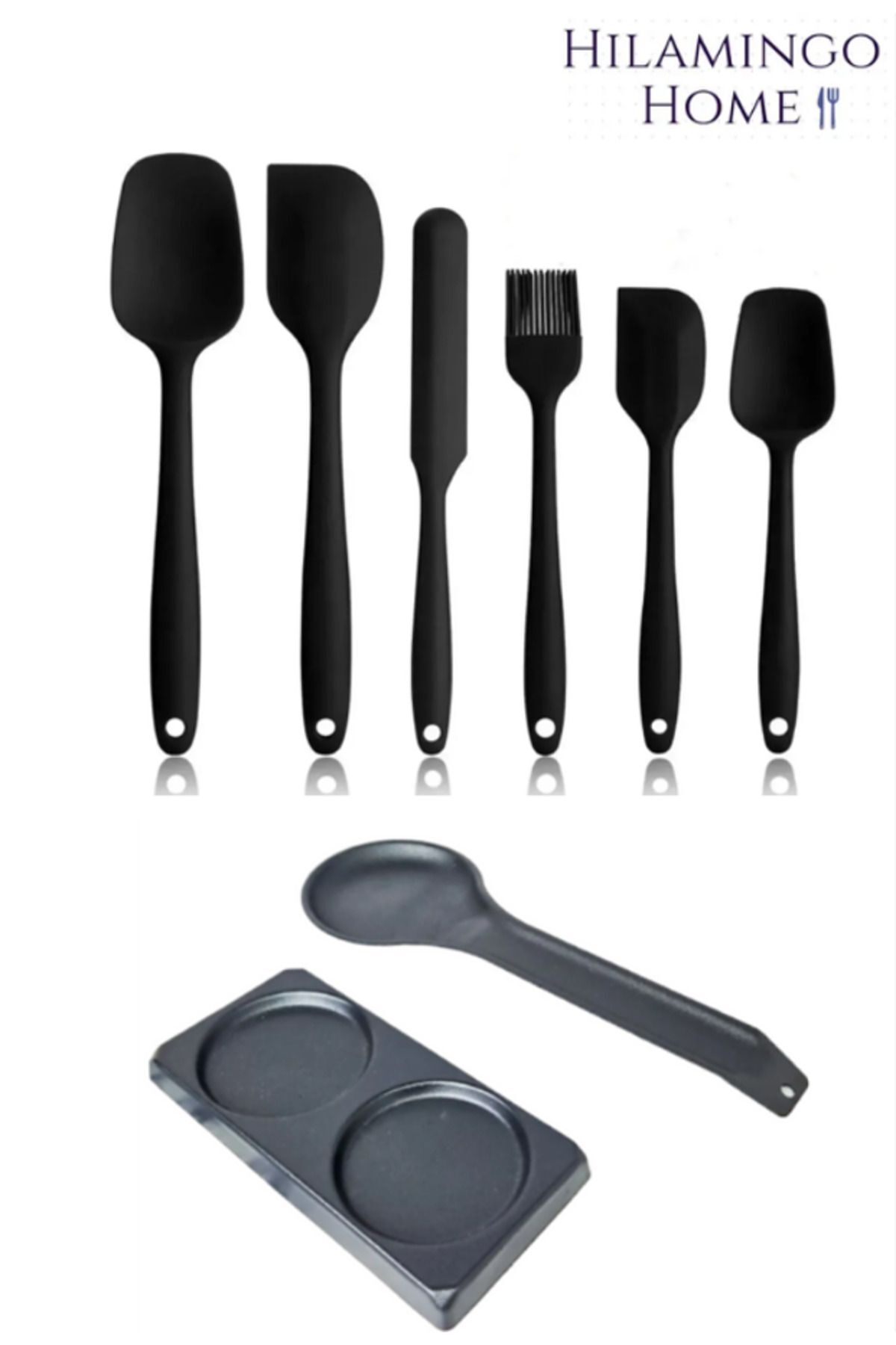 8 Parça Mutfak Gereçleri Seti;Metal Kaşıklık+Metal Altlık+6 Parça Silikon Spatula Set